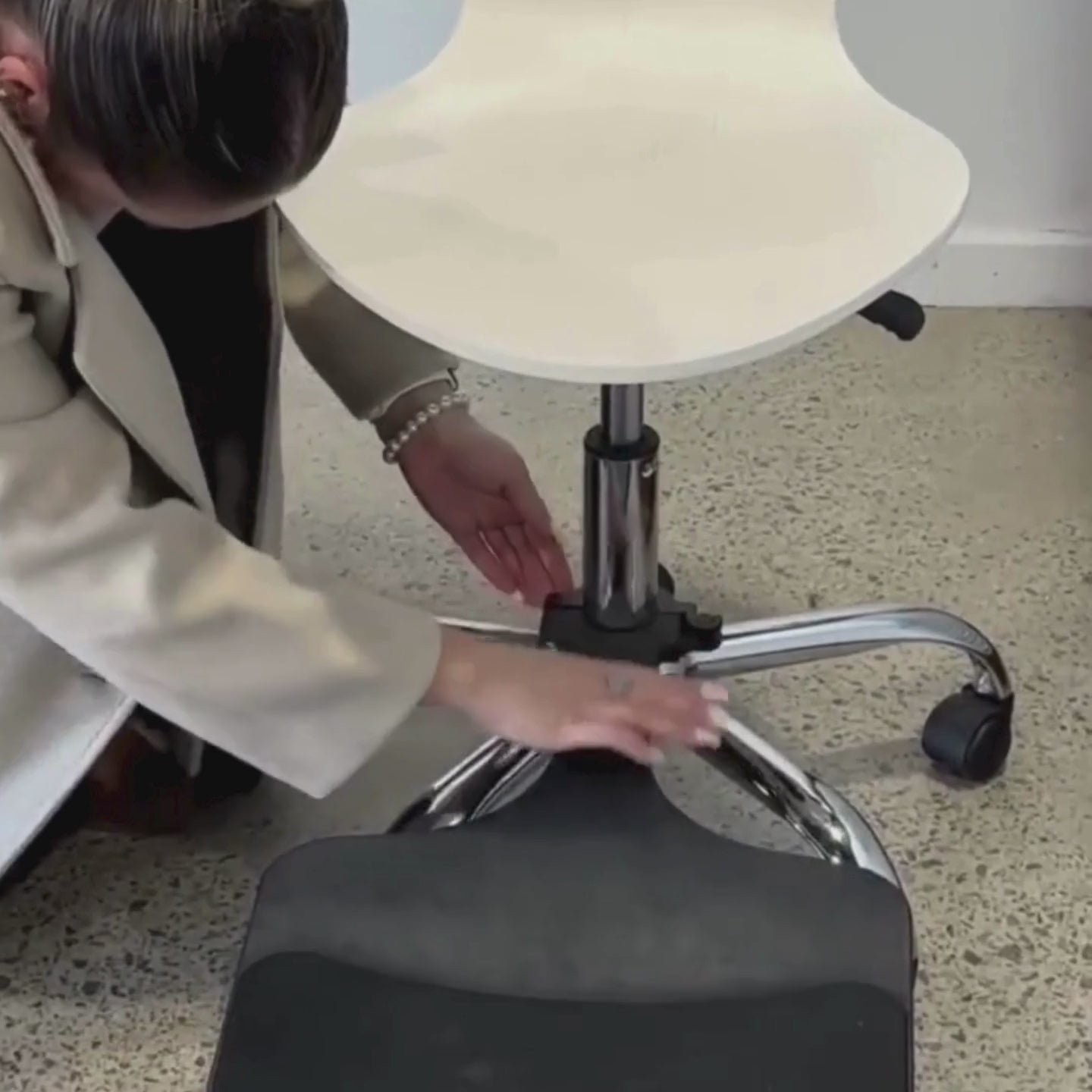 A one piece Injection moulded foot rest that attaches to the stem of your office chair to assist with correcting your posture when sitting at a desk.